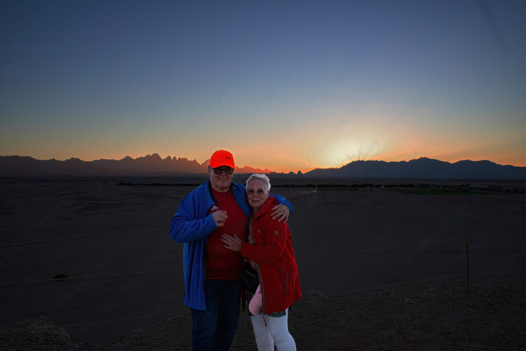 Safari, Safari,.. Die Fahrt in einem Jeep begann harmlos. Sitzhöhe 30 cm, wenig Halt und ... very fast flogen wir über die Straße doch als sich die Straße in einen unebenen Wüstenboden mit heftigen Schlaglöchern verwandelte, verging allen Mitfahrenden das Lachen... und ging in achtsames Beobachten über bei 80 m/h war nicht mehr an kontrolliertes Fotografieren und Filmen zu denken, nur Staub hinter uns mit einigen Blessuren (Stauchungen Wirbelsäule) kamen wir im Beduinendorf an und hoch zu Kamel (für die Klugschieters: es war ein Dromedar) ging es los Sonnenuntergang in der Sahara